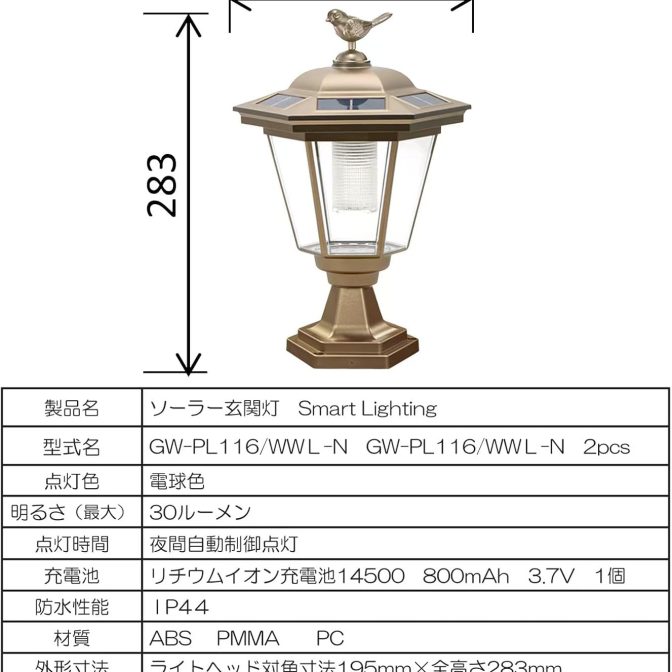- ★【特長】:かわいい小鳥模様 ランタン型 門柱灯、玄関先の雰囲気作りに最適。屋外 ソーラーランタンライト、和風のかわいいランタンの光り、我が家のシンボルに!! 型番:GW-PL116/WW-N(2P/S)