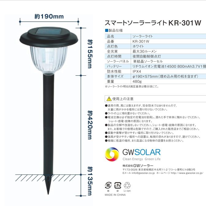 - ★【仕様】ホワイトLED、明るさ:30 ルーメン、点灯時間:夜間自動制御点、リチウムイオン充電池内蔵:14500 800mAh 3.7V、防水性能:IPX4、寸法:Φ190×高さ575㎜(挿し込み部分含まず)、材質:ABS アクリル PP、質量:1個当たり480ℊ 型番:KR-301W(3pcs)