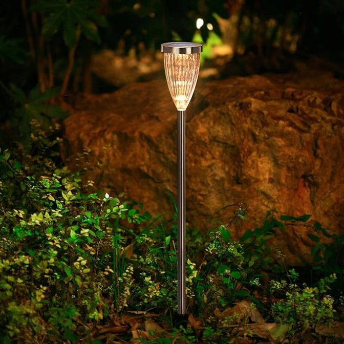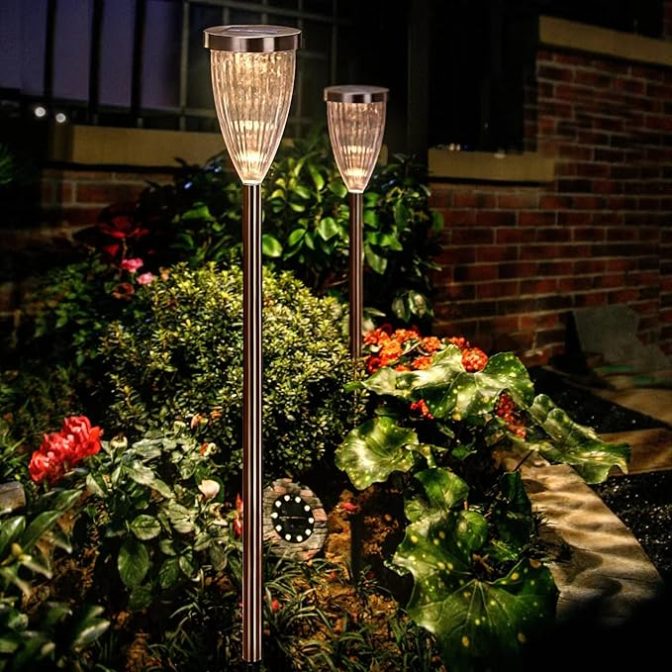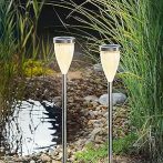 - ★【仕様】2本組セット、点灯:電球色、明るさ:約10ルーメン、電源:太陽光パネル充電、ニッケル水素充電池単4形600mAh内蔵、点灯保持時間:フル充電後約8時間。防水性能:IPX4、商品サイズ:ライトヘッド直径90㎜、高さ:767㎜(アンカー部込)、質量:約230g(1本あたり)