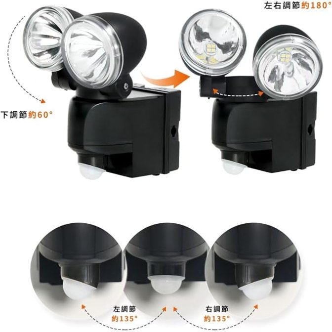 - ★【仕様】センサー: 検知距離:約6m,検知角度:約90°(高さ2m設置時)、センサー部: 270°左右調節可 ; ライトヘッド: 上下60°/左右180°調節可、LED: 日亜製ホワイト色、点灯モード切替可、赤外線センサー感知10秒点灯/常時点灯 ; L金具クランプ台セット、取付け用バンド、固定用ネジ・プラグ付属・取扱い説明書/保証書付き