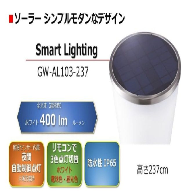 GWSOLAR ソーラーLED街路灯【Smart Lighting】明るさ400ルーメン アルミポールライト 高さ:237㎝ リモコンで点灯時間選び 昼光色・電球色・白色調節【型番: GW-AL103-237】